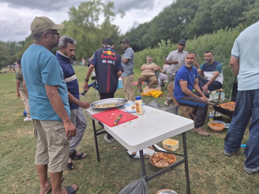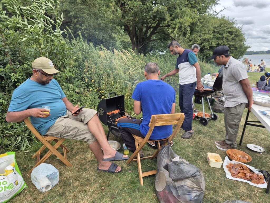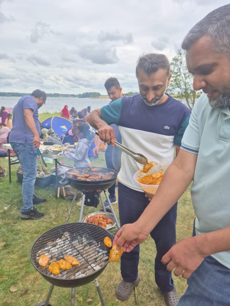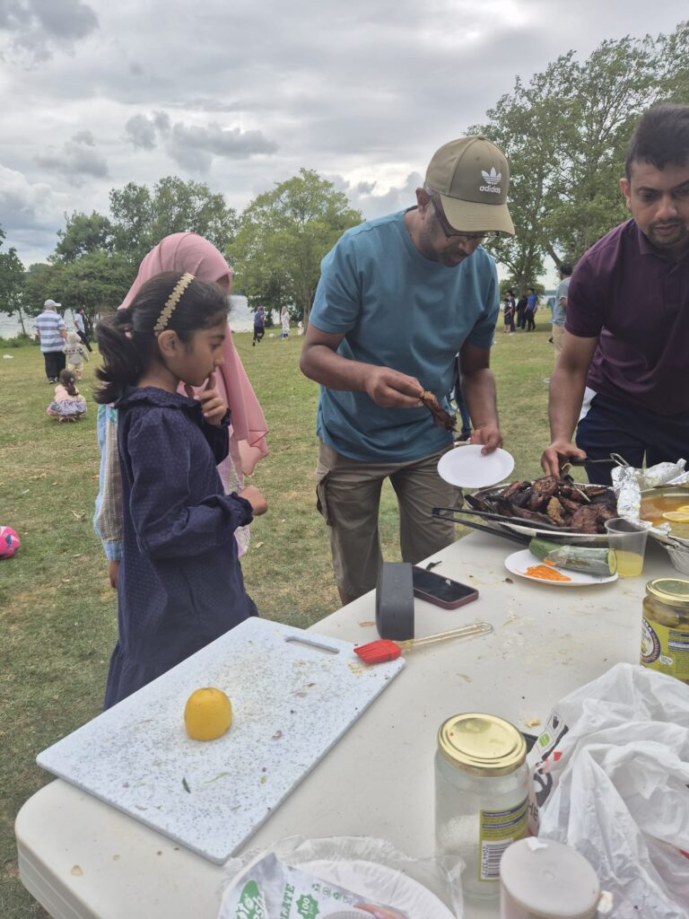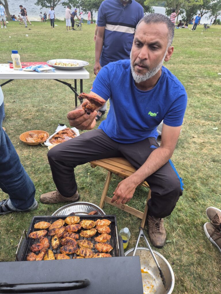 Following Dhuhr prayer, the afternoon began with preparations for a hearty lunch. The atmosphere quickly filled with the aroma of grilled delights as drinks were poured, salads chopped, and barbecues fired up. A generous and varied feast was served on sahans and paper plates—featuring succulent chicken wings, juicy burgers, tender lamb chops and ribs, beef steaks, sizzling sausages, and sweet corn on the cob.